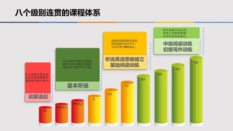 孩子只需4~6年,孩子通过四到六年“先听说、后读写”的浸泡式快乐学习,不背单词、不记语法,在小学六年级之前,完成高中乃至大学英语内容学习,轻松应对中高考、托福等英语考试,实现英语完美抢跑,为初高中及大字其他课程学习,赢得宝贵时间;同时具备英语思维能力,拥有流利标准的口语、优秀的听力以及良好的英文阅读能力和初级写作能力,英语语言能力可达到美国同龄孩子平均水平,真正实现英语的母语化。